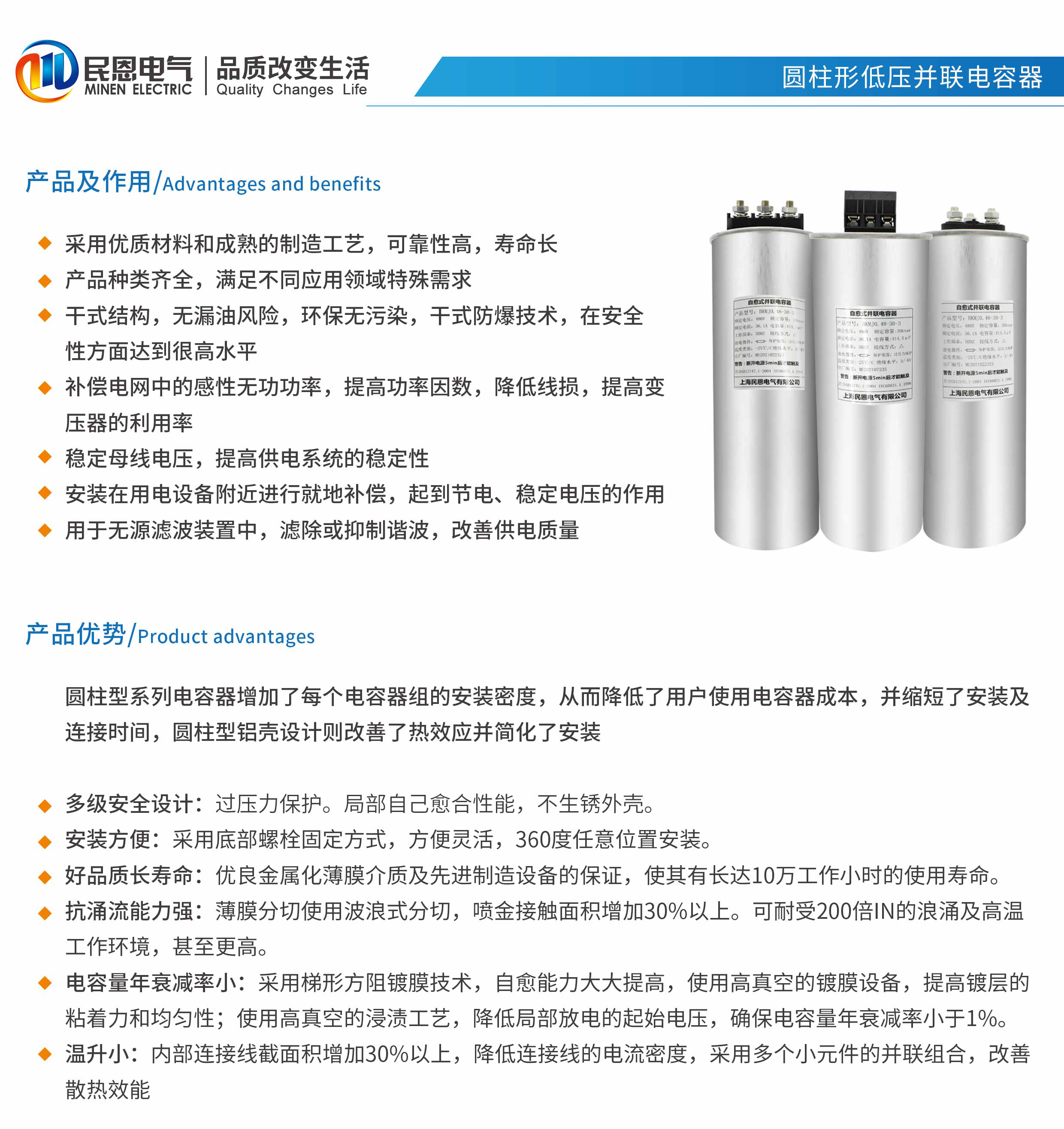 電容器內(nèi)部集成了三相分別獨(dú)立的單元,每個(gè)單元采用經(jīng)金屬化處理的聚丙烯薄膜為絕緣材質(zhì)特殊的薄膜鍍層設(shè)計(jì)及邊緣加強(qiáng)設(shè)計(jì),使電容器具有良好的自愈能力和抑制大電流能力。 創(chuàng)新的真空灌注技術(shù),可保證電容器具有良好的熱穩(wěn)定性及散熱性。 電容器在承受過電壓或臨近使用壽命時(shí),電容器內(nèi)部元件不斷發(fā)生擊穿-自愈循環(huán)直至元件破壞,這一過程將導(dǎo)致電容器內(nèi)部壓力不斷增加,為了防止不斷增加的壓力導(dǎo)致電容器殼體發(fā)生破裂,電容器內(nèi)部安裝了過壓力保護(hù)裝置通過釋放內(nèi)部壓力使端蓋與元件之間的連接斷開阻止電流流過,從而防止電容器由干過載或過熱引起的爆炸。 電容器內(nèi)置放電電阻,使電容器在離網(wǎng)后能夠自行放電,確保人身安全