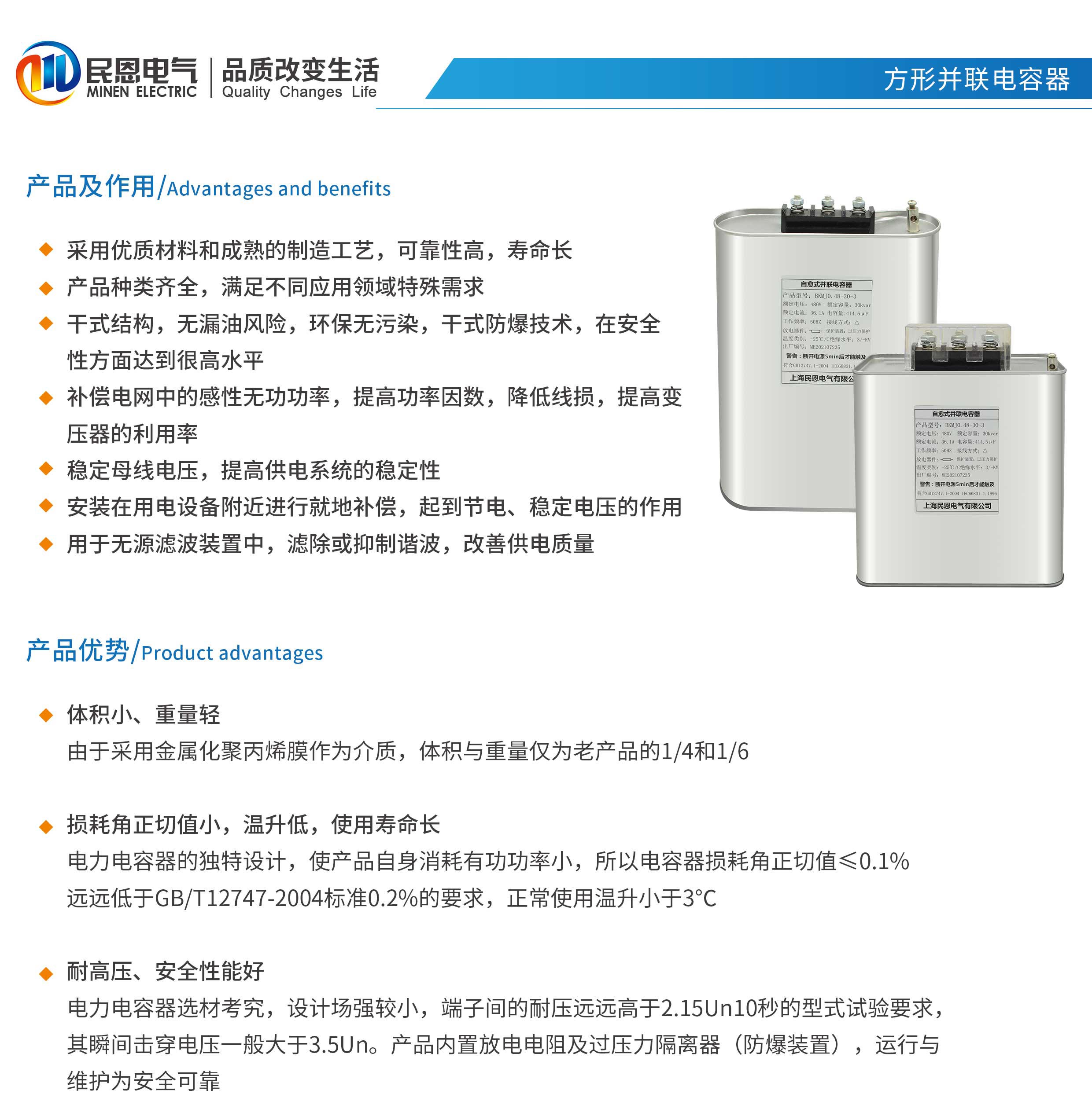 采用優質材料和成熟的制造工藝,可靠性高,壽命長,產品種類齊全,滿足不同應用領域特殊需求,干式結構,無漏油風險,環保無污染,干式防爆技術在安全性方面達到很高水平,補償電網中的感性無功功率,提高功率因數,降低線損提高變壓器的利用率,穩定母線電壓,提高供電系統的穩定性,安裝在用電設備附近進行就地補償,起到節電、穩定電壓的作用,用于無源濾波裝置中,濾除或抑制諧波,改善供電質量